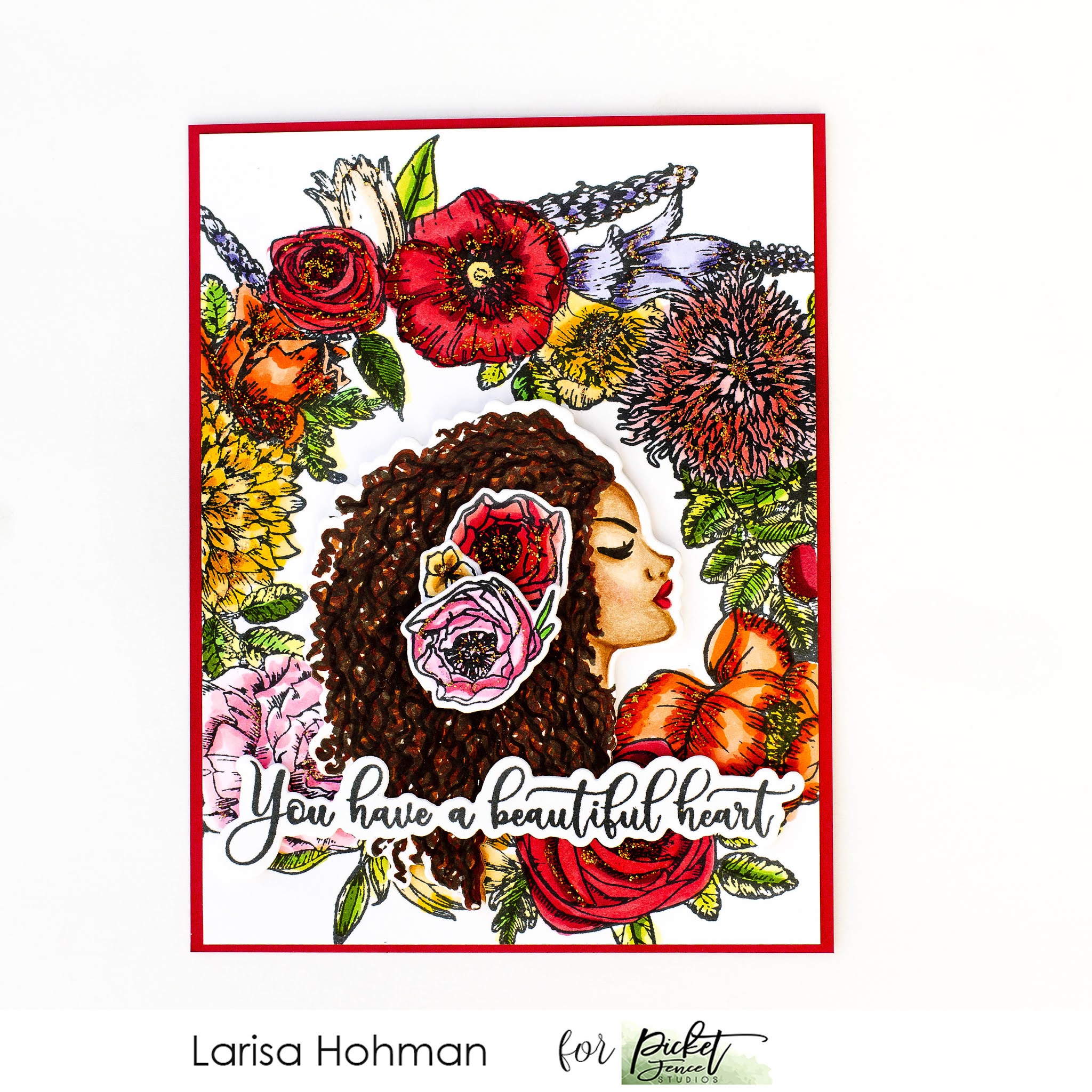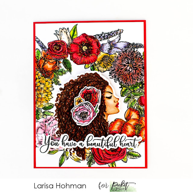 Hello!  Today, I'm sharing a vibrant, floral card using Beautiful Girl Sierra!  This stamp is gorgeous and I had so much fun coloring her up!  To begin, I stamped her out in tan ink and colored her up using the no-line coloring technique.  Then I die cut her out using the coordinating die.  For the background, I used the NEW Beautiful Girls Flower Wreath.  I stamped it out, colored it up with Copics, and trimmed it to fit my A2 sized card.  Then I added my Sierra image to the center of the wreath using some foam tape.  For the flowers in her hair, I wanted them to pop.  So I added some of the roses from the Beautiful Girls Flower set.  Then I stamped out my sentiment, cut it out with the coordinating die, and popped it across the bottom of my card using foam tape.  Some Stickles glitter over the flower images finishes this card off.