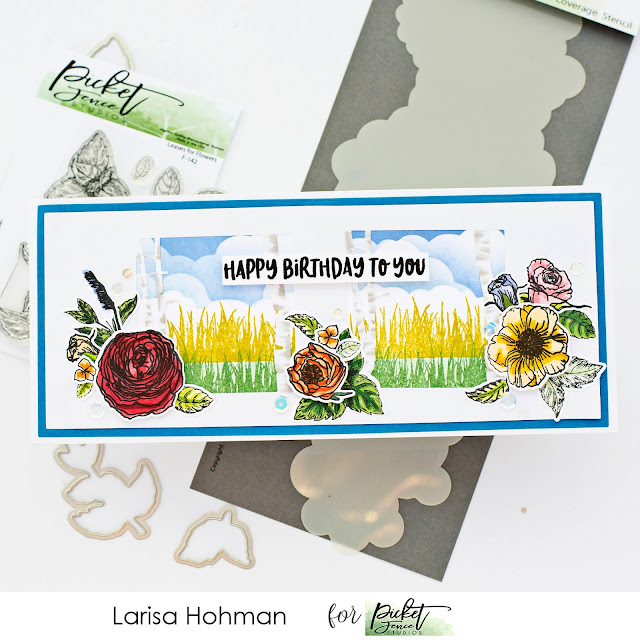 Hello! Larisa here and today, I have two very bright and very colorful scene cards to share with you! For my first card, I paired A Walk in the Park with Bugville. I stamped out my park scene and masked it off. Then I stamped Bugville in the background. I colored up the scene with copics and trimmed it to fit my A2 size card. Then I stenciled in my sun with distress inks. A very vibrant way to say, "hello!"