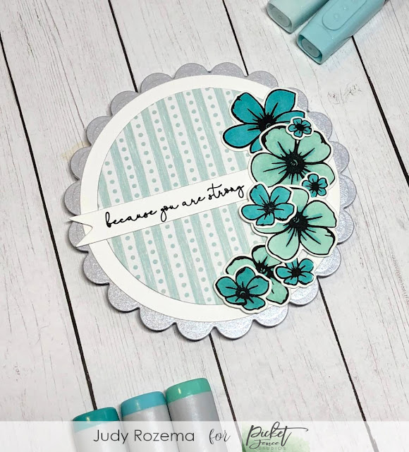 I made a monochrome card using a favorite color family, and colored the flowers with my alcohol markers. Then I cut them out using the coordinating dies, and made a round card. I had a scrap of patterned paper that matched, and added a sentiment from the previously released BECAUSE.