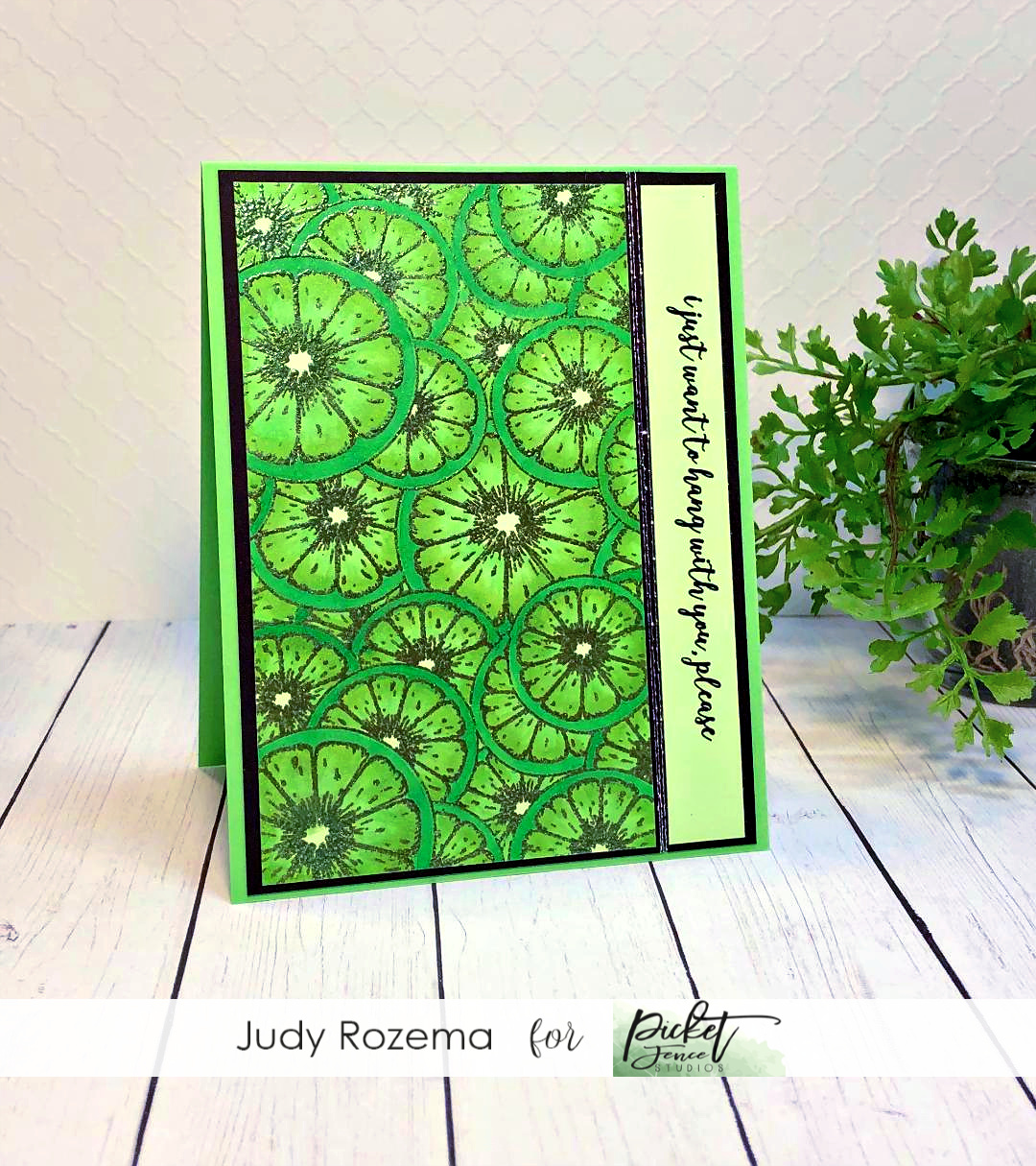 I stamped with VersaMark ink, and then embossed with Bullfrog EP. I colored with Copic markers, making one of the limes stand out with brighter colors, and Stickles around the rind. I added some fun lime patterned paper for a little interest on the back panel. My sentiment is from the previously released Pucker Up.