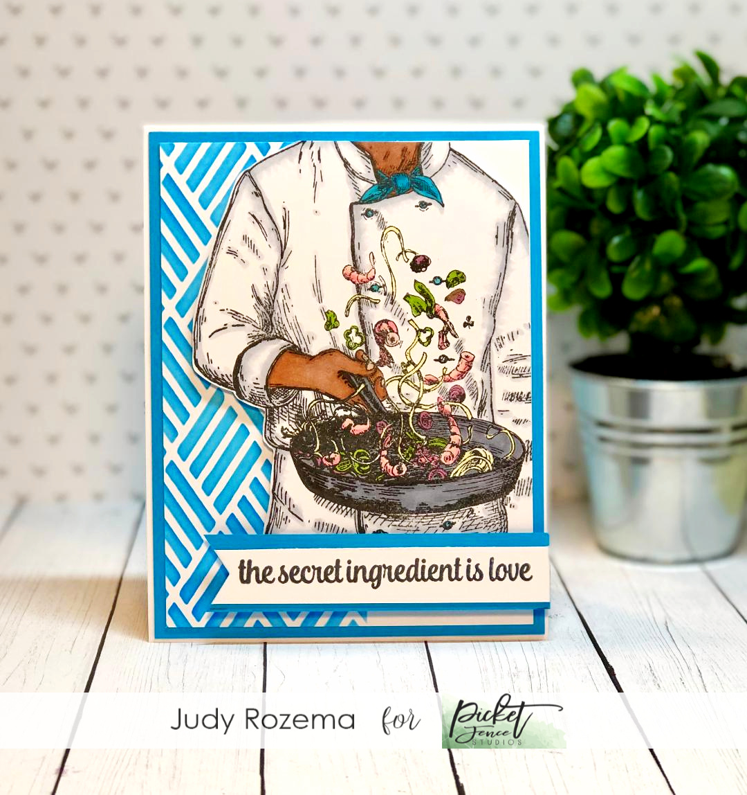 I used Gina K's Blue Raspberry ink with my stencil and Life Changing Blender Brushes. I stamped the chef in Black Hybrid ink and colored with Copics. I fussy cut him out, and popped him up with foam tape. The sentiment is stamped with VersaFine Clair Morning Mist. And of course, there is lime on that shrimp!