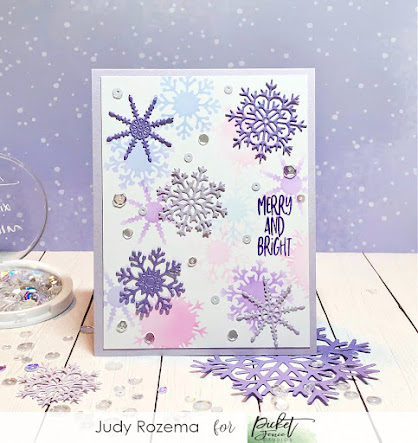 Finally, I used just the Winter Snowflakes to create this frosty card of pinks, blues and purples. I used the negative dies as STENCILS (!) and lightly blended different colors of DOX inks with my Life Changing Blender Brushes. I added die cut snowflakes on top out of shimmery cardstock for a winter blizzard, and a sentiment from Inside Quotes: Christmas to complete the look - with of course sparkly sequins: Gin and Tonic!
