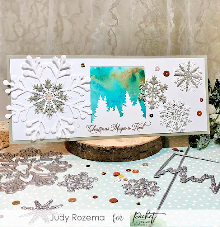 Next up is the same snowflake - with the addition of the beautiful Winter Snowflakes Dies. I used the Slim Line Die Cutting System to cut my layers, and then centered the evergreen tree die in the center. I cut many snowflakes out of white and kraft cardstock, and layered them up on my main panel, along with the Snowflake Lydia Die.