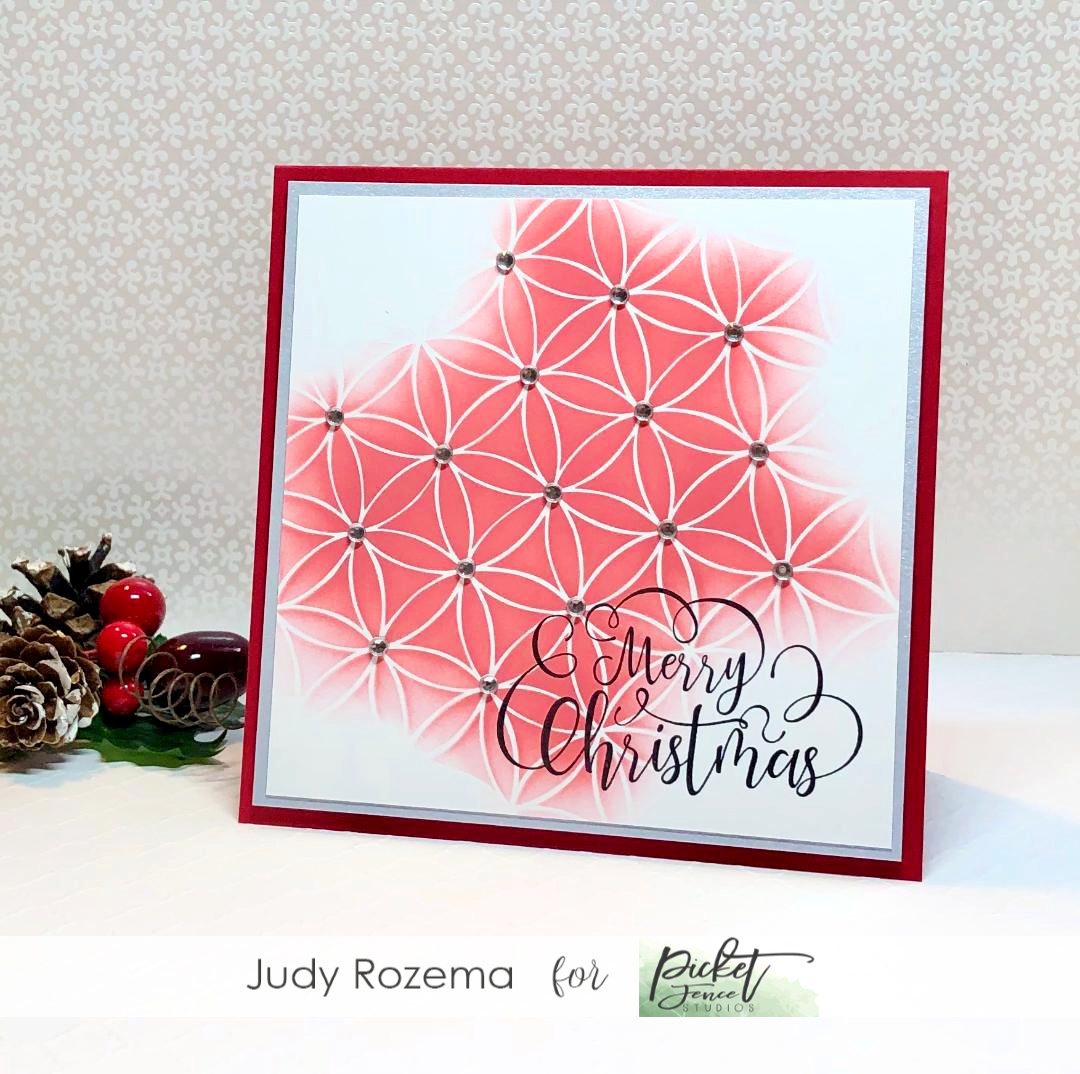My final card today moves to Christmas with the FLOWER OF LIFE STENCIL. I again used my Wendy Vecchi Stay-tion (it makes stenciling SO much faster!) to hold my stencil in place. Festive Berries DOX was my color of choice here. I wanted to give the illusion of red poinsettias and/or Christmas plaid by fading out the edges. My sentiment is from the new BABY IT'S COLD OUTSIDE stamp set, stamped in BLACK HYBRID ink. I added clear rhinestones in the center of each flower.