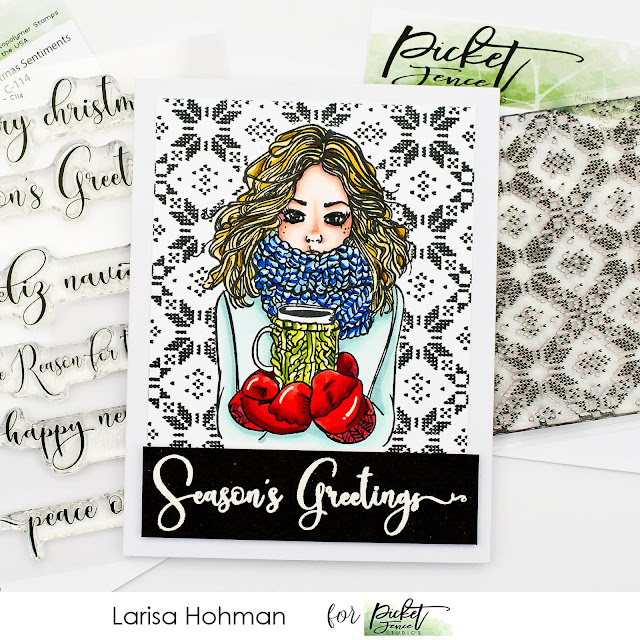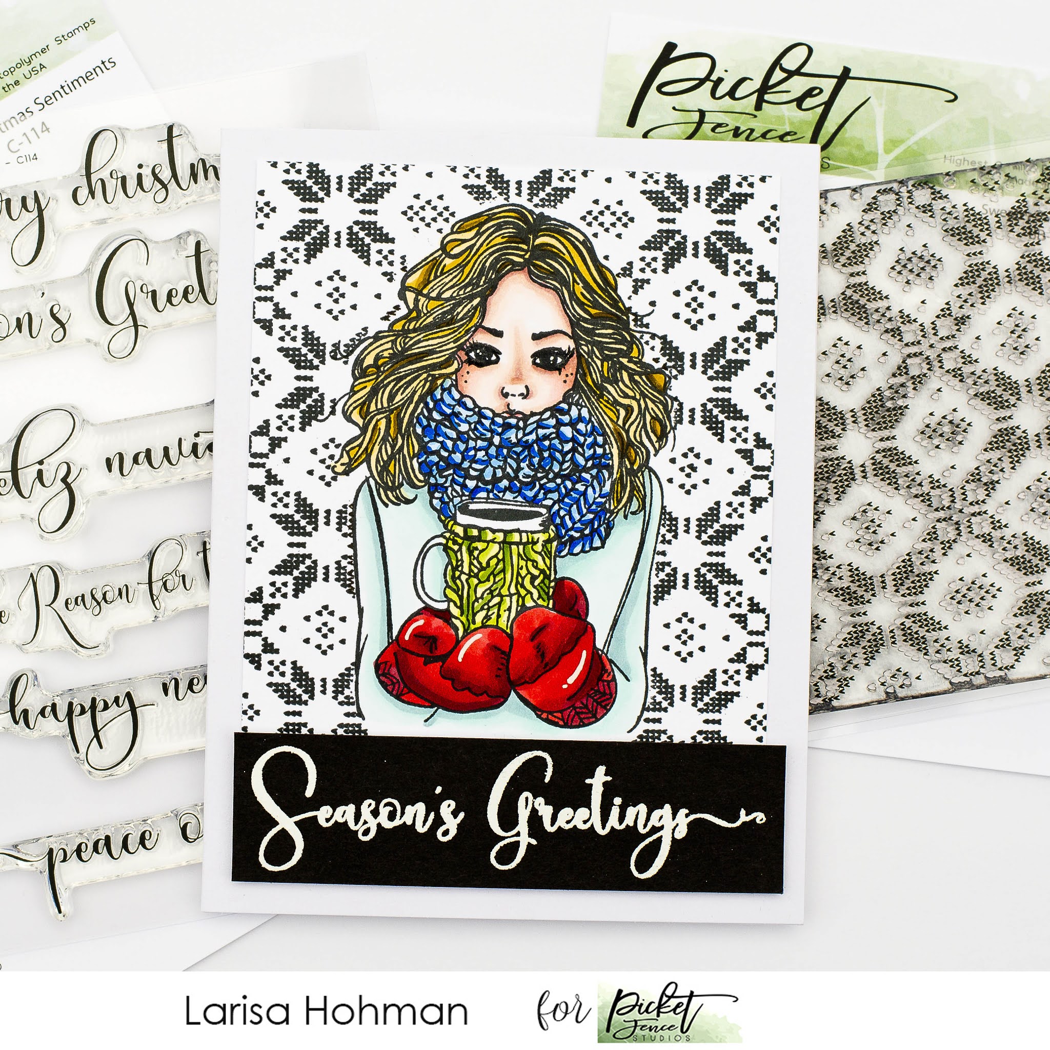 For my next card, I used the NEW Sweater Pattern Maker Stamp. This is another seamless stamp that matches up perfectly when you stamp it multiple times. For my card, I stamped it twice. You can't even tell. It really is seamless! I decided to pair it with the Jill Girl Stamp. I stamped her out first, masked her off and then stamped my background on top. I kept things classic and stamped the pattern in black on white card stock. Then I trimmed it into a rectangle and mounted it to the front of my card base. I removed the mask and colored the image up with Copics. For the sentiment, I used the NEW Fancy Christmas Sentiments Set. I stamped my sentiment on a chunky piece of black card stock and heat embossed it in white. Then I added it to the bottom of my card, and there you have it, one warm and cozy holiday card.