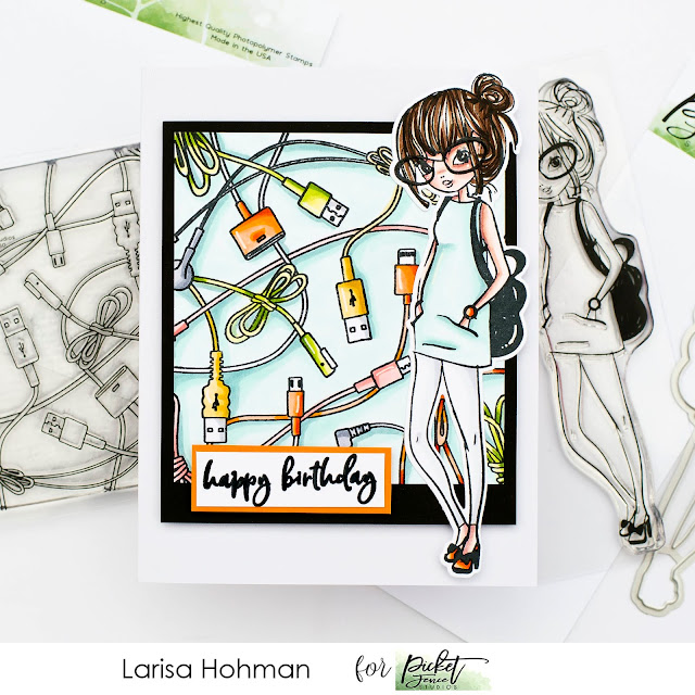 For my first card, I used the NEW All Wired Seamless Stamp! How fun is this! I only stamped it one time for my project, but the really cool thing about these seamless stamps is that the match up perfectly and you can stamp them multiple times to create a background in whatever size you want! For my card, I stamped it once, trimmed it into a square and mounted it on a piece of black card stock. I colored it up with my Copic Markers and added a few highlights with my white gel pen. I thought this background would coordinate well with BFF Claire. So I colored her up, cut her out with the coordinating dies, and popped her on top of my card using foam tape. Then I added a "happy birthday" sentiment from the Kylee Boo Stamp Set. I just love how this turned out! Such a fun way to say, "happy birthday."