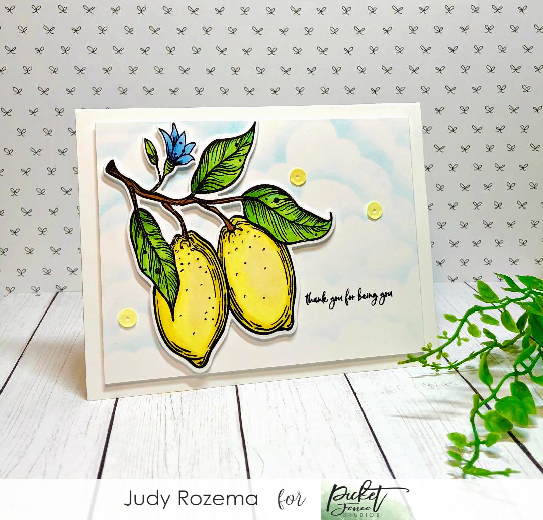 I used Layers of Clouds Stencil for my background, and added soft sponging with Tumbled Glass DOX. I didn't want the background to overshadow the bright lemons! I stamped the sentiment to one side. Images were stamped with Black Hybrid ink and colored using Copic markers.