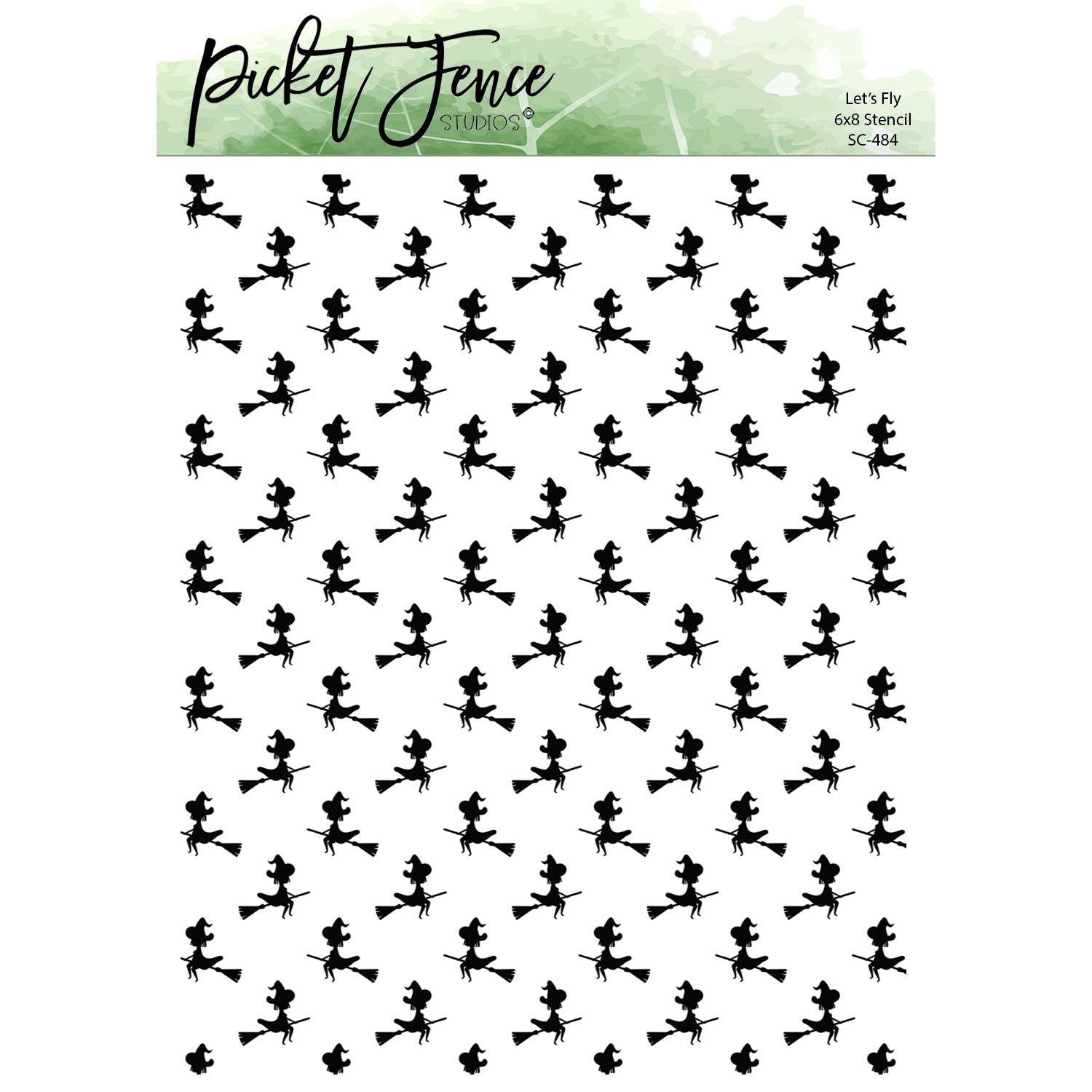 Let's Fly 6x8 Stencil includes a single 6x8 stencil featuring a cute witch flying on a broom stick in two different directions.