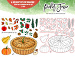 6x6 stamp set with coordinating die set featuring a large pie with 28 smaller images and one sentiment to turn this into any type of holiday pie.