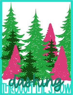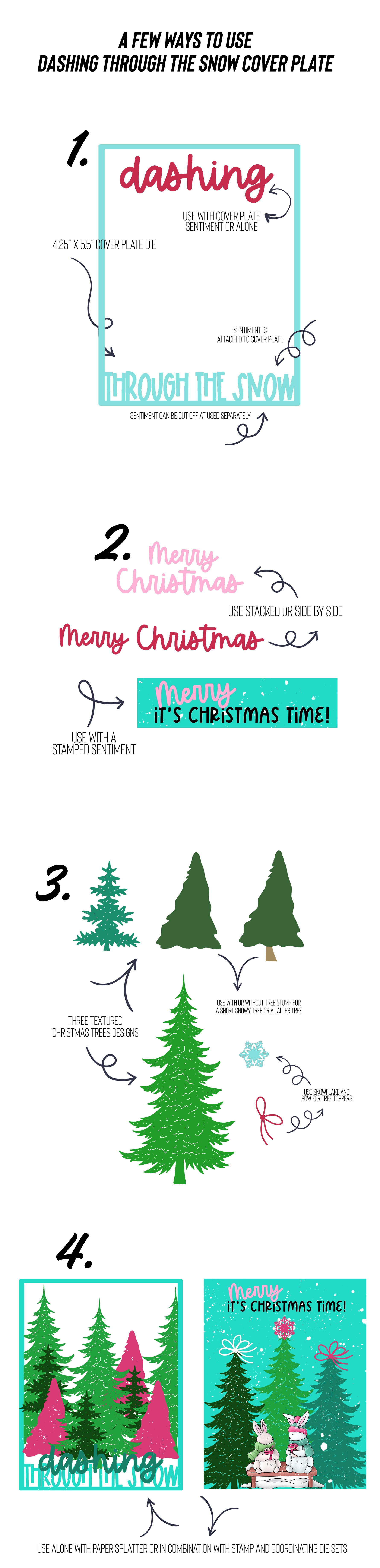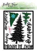 Dashing Through the Snow A2 Cover Plate Die  (4.25 x 5.5) including three trees, one bow, one snowflake, and the words Merry Christmas and Dashing. The A2 Cover Plate has the words: Through the Snow attached to the inside bottom portion of cover plate.